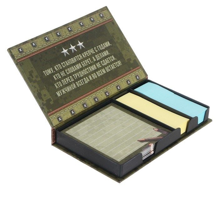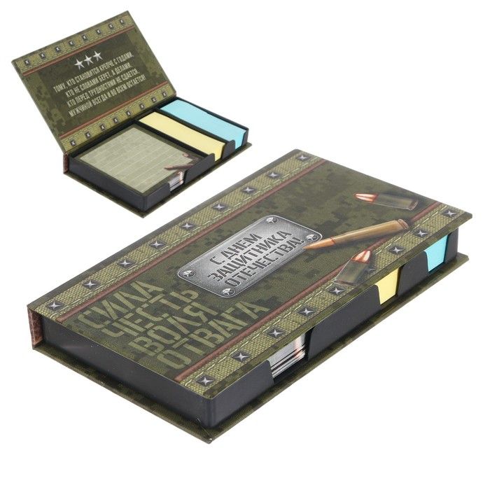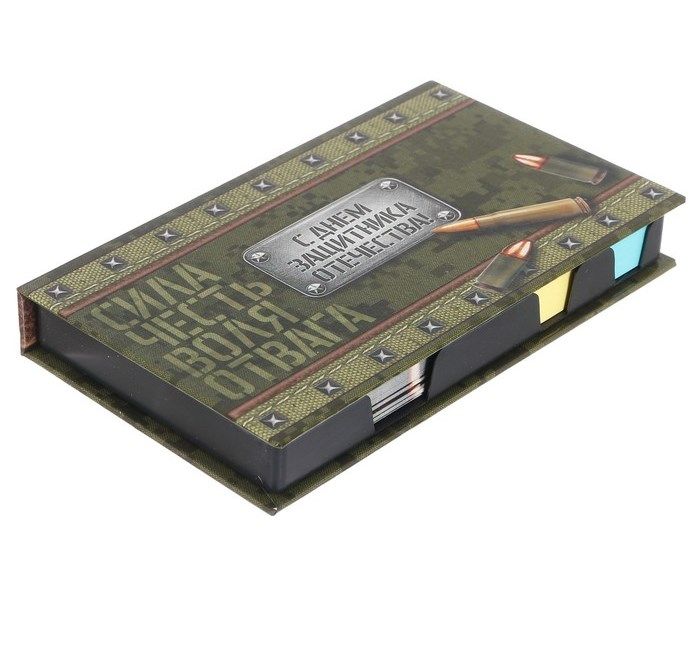 Бумажный блок в пластиковом футляре "С Днём защитника Отечества": 100 листов и 2 набора стикеров- станет оригинальным подарком для мужчин, парней и руководителей к 23 февраля!