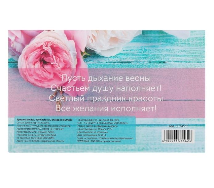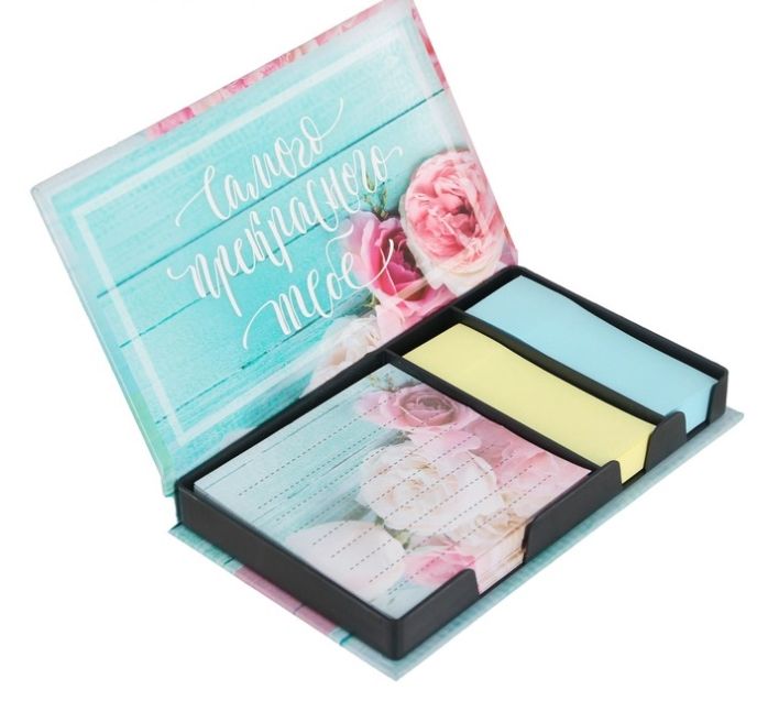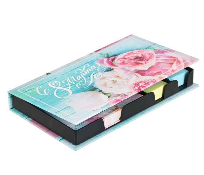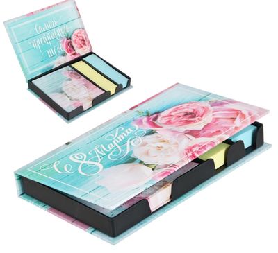 Бумажный блок в пластиковом футляре "С 8 марта": 100 листов и 2 набора стикеров