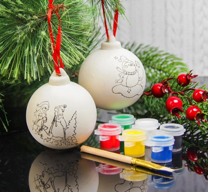 Набор новогодних шаров под раскраску 2 шт + краска 6 цв по 2 мл, кисть - оригинальный и творческий Новогодний сувенир-раскрашка для детей!