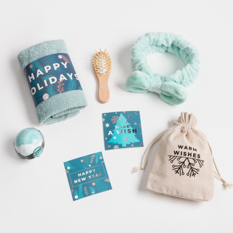 - Составляющие набора: Бомбочка для ванн, Открытка, Повязка, Полотенце, Расчёска