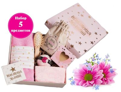 - Составляющие набора: Бомбочка для ванн, Открытка, Повязка, Полотенце, Расчёска