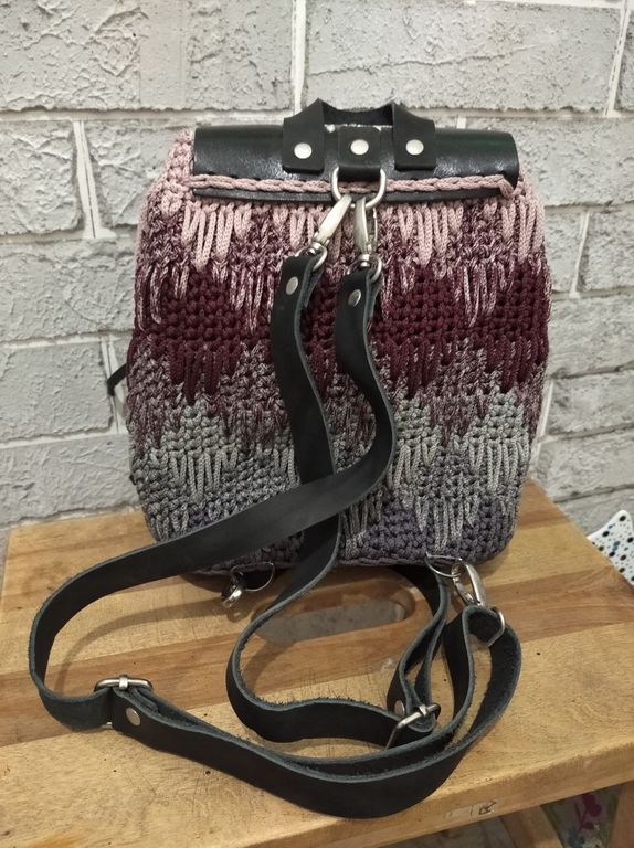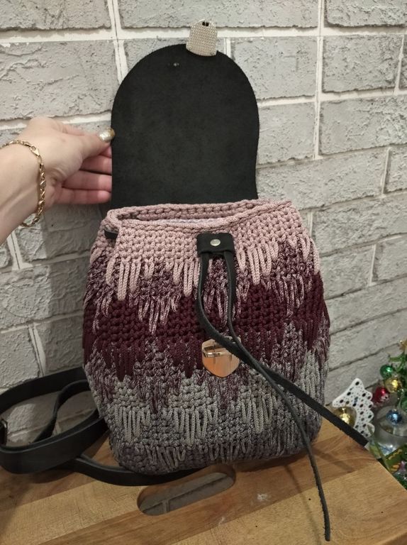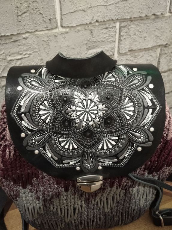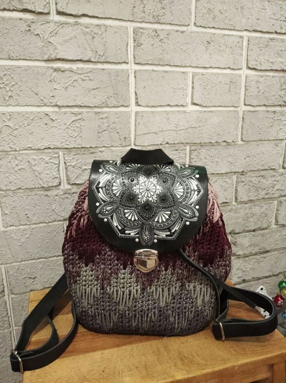 Тренд сезона! Рюкзак женский "Пряная вишня" с уникальным кожаным клапаном в виде мандалы ручной работы - это изысканный женский аксессуар с практичным и ярким вязаным узором!